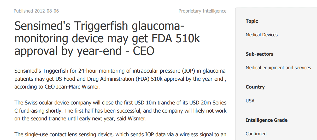 Sensimed’s Triggerfish glaucoma-monitoring device may get FDA 510k approval by year-­end -­ CEO